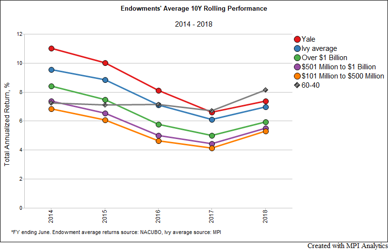Yale dominates the rest, followed by the “average Ivy”. Interestingly, there is a relationship between performance and size, with larger endowment averages leading mid- and small-endowment systems, respectively, resulting in the lines being mostly parallel. As we noted in our fiscal year 2018 Ivy report, the 60/40 portfolio’s 10Y performance over the past several years overtook all Ivies and all endowment averages.