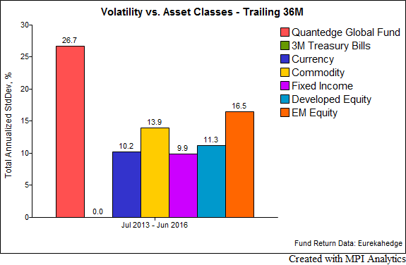 A July 20th WSJ article featured Quantedge Capital, a quantitative global macro hedge fund manager that gained 40% after fees year-to-date through June. The fund’s 2016 performance is outstanding indeed, as compared with major asset classes in the chart below (here and below we use the fund’s performance data from Eurekahedge):
