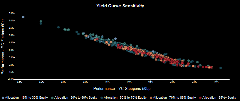 MPI risk functionality also allows users to analyze performance at the peer group level. For example, the chart to the right maps peer group performance to identify funds that would benefit most from a steepening and flattening yield curve.
